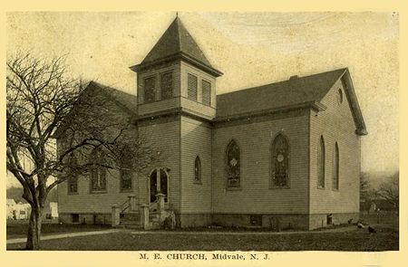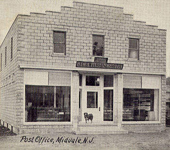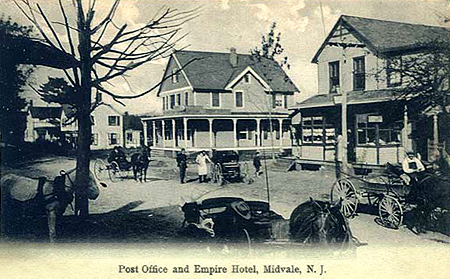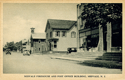 The postcard view from the 1930's showing the Midvale Post Office (right), Shippee's Pharmacy (center), the Firehouse and the intersection of Railroad Avenue. The Post Office building replaced the wooden structure as seen in the color tinted photo above. You will also notice that the dirt road has now been paved. Railroad Avenue, on the right, as mentioned, ended at the Midvale Station.