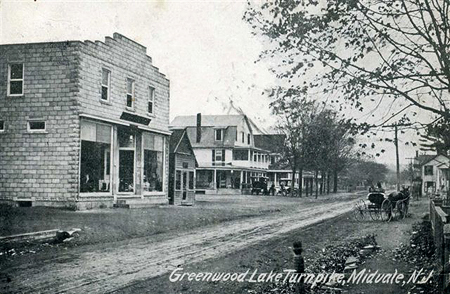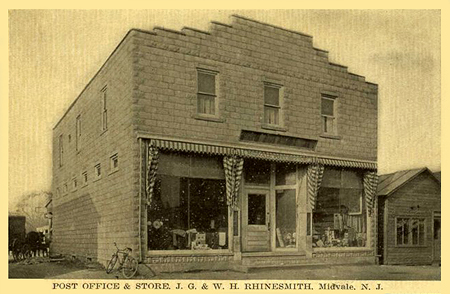 The Midvale Post Office changed locations a number of times. In the above Russo Ringwood Avenue photo the building next to the Rheingold billboard was the site of the structure pictured directly above, the J.C. and W.H. Rhinesmith store. It would have been across Ringwood Avenue from the Post Office in the previous horse and buggy photos. The postcard image on the right shows the same building looking northwest. The Union House is visible in the center of the photo.