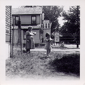 The above close up of the photo on the right shows what could be had at the shops. According to William Truseewicz, the fish monger at this location would often peddle his fish using a lined wicker basket and go to customers as far away as Mahwah. This photo from about 1954 is of Carole and Eva Egan in the front yard of the building described above. The original wrap-around porch of the building has already been removed.