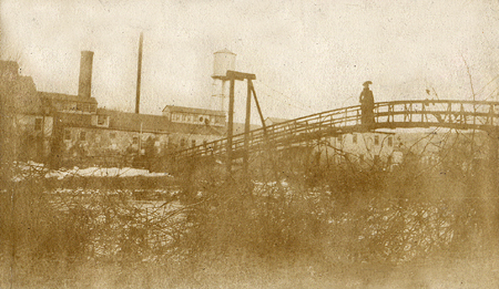 Another photo from about 1905 showing Stella Butler crossing the suspension foot bridge across the Wanaque River. The bridge connected Hook Rd. to the Paper Mill site.